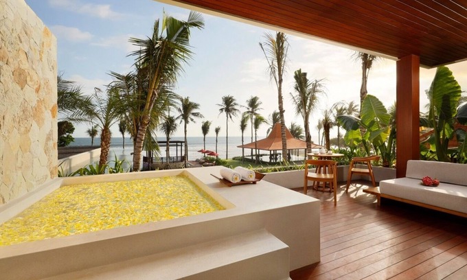 Wake up to the soothing sound of the waves and enjoy the beautiful ocean view from your private balcony or large windows. The room features a plush king-size bed with luxurious linens, an elegant seating area, and decor inspired by Bali's natural beauty.