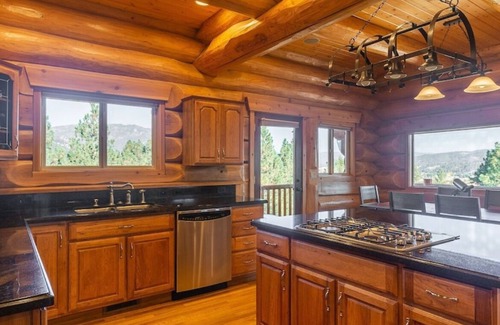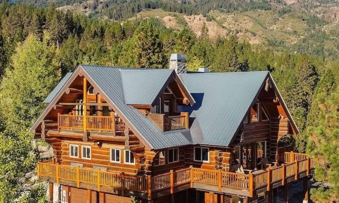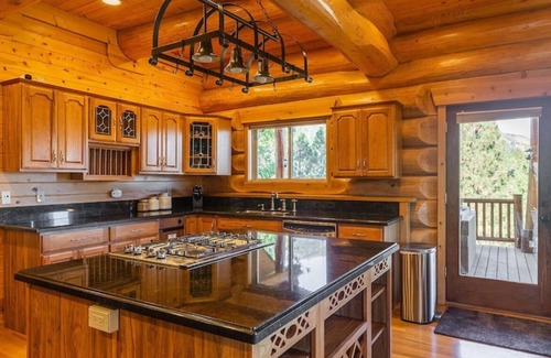 At the top of a hill in Garden Valley, ID, this beautiful, unique log cabin perches for all to see. From this vantage point you can enjoy nearly 360 degree views of the surrounding mountains and valleys. Step outside to relax on the wrap around deck, or enjoy lounging by the outdoor fireplace. Inside you'll enjoy three levels of unique craftsmanship and inviting living spaces. A large fireplace in the main living area keeps everyone in the cabin toasty and warm, while the adjacent kitchen is furnished for any baking or cooking needs. Downstairs you will find the second living area, complete with a large sectional, cozy gas fireplace, a kitchenette, full bath, and a bunk room with 6 twin bunks and a queen bed. The third floor houses three separate bedrooms, including the master suite, and another full bath. NOTE: In the winter, snow tires, 4 wheel drive, and chains may be required to get up the driveway. We hope you enjoy what our place and Garden Valley has to offer.