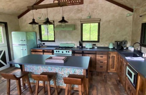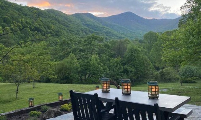 Custom reclaimed wood furniture and a custom built Murphy bed with a queen-size memory foam mattress are crafted by local artisans. There is a queen-size leather sofa-bed for additional sleeping capacity. There are French doors that open to a large covered front porch overlooking the majestic mountains as well as a patio with a hot tub and fire pit for relaxing and star gazing. There are virtually no mosquitoes or biting insects here which makes it so pleasant to sit outside on the porch and read your favorite book, enjoy a candlelight dinner on the patio, or count the fireflies and stars. You can enjoy the quaint shops in downtown Waynesville and Asheville or take off exploring the outdoor wonders of the Great Smoky Mountain National Park.
