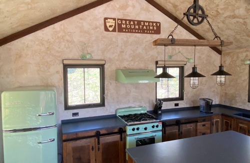 This is a large, bright one room studio cabin with 400 sq. ft of covered deck and patio space with gas grill, fire pit, and hot tub overlooking the mountains. The design is a unique combination of retro design accents mixed with rustic custom-made cabin furniture and topped off with a Tuscan Villa theme. The vaulted ceilings and a spa inspired bathroom with windows facing the private woods, Italian tile, walk-in large shower and custom made cabinets help create a tranquil and serene retreat for our guests. Located 11 minutes from the Blue Ridge Parkway and the Gateway to the Great Smoky Mountains National Park. This is a great escape to unwind free from the distractions and craziness that life can sometimes bring. Having said that, there is fast Wi-fi for any streaming needs. We put our hearts and souls into this cabin so it is very special.