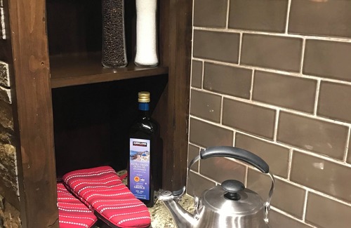 Unwind in the always-hot large hot tub or enjoy a steam shower. The home boasts custom features including a timber and log frame, etched art glass, Venetian plaster walls, and a stunning handmade chandelier that enhances the ambiance.