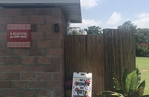 Buffalo Knights is a one of a kind (air-conditioned for those wondering) tipi that is part of Olliewoods Oasis - a mix and match of colorful and eclectic sleeping options that make the setting outta sight and totally fab! The property is 2.5 acres and is adjacent to 180 acre Crescent Bend Nature Park. The owners' home is on the front side of the property and the three sites (Buffalo Knights, Ruby Any Day and the Glory Nest) are located on the back/park side of the property with a path provided directly into the park. The owners share their pool with guests and the property also has a 30x30 covered pavilion, covered pickleball court, volleyball court, outdoor hot water shower and a separate bathroom/shower house (Groovy Go Go) for all guests to use. For additional family fun, board games, movies and outdoor yard games are provided along with pickleball paddles to try the fastest growing sport in America!
