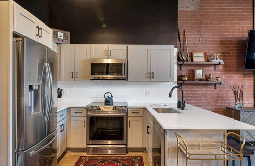STUNNING & Industrial 6 BEDS luxury condo with a huge glass garage door. This condo has been featured in numerous photo shoots! Located in a gated community called The 1865 – a converted 150-year-old tobacco barn. Enjoy FREE parking & a POOL with outdoor furniture, a grill and a bar area. Speakeasy Bar in the building as well! Use our fitness Gym & watch the stars on the observation deck. Washer/Dryer. Only 2 miles to Downtown Broadway bars & 1 mile from Vanderbilt. Walk 2 blocks to Starbucks!