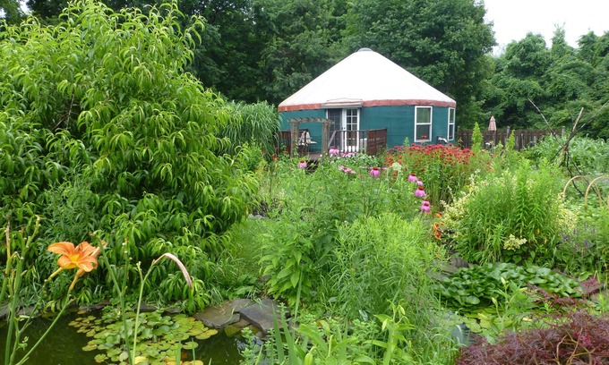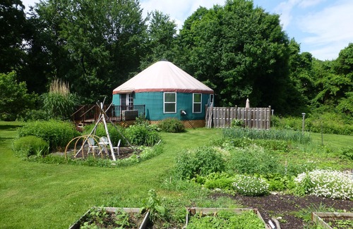 Climbing Vine Cottage is a custom-designed yurt surrounded by gardens, orchards bird and butterflies near our home. The yurt features a fully equipped, eat-in kitchen (includes award winning, locally roasted coffee) with seating for 6. The bathroom is stocked with towels, local soap, shampoo, etc. Sleeping accommodations include a lovely master bedroom (queen size bed) with Smart TV, fold out futon bed in the living room (full size) and two twin beds in the loft. In the winter months the yurt stays cozy with a high efficiency ductless mini-split. You can adjust the themostat but otherwise you don't have to do anything to enjoy a cool yurt in the summer and a cozy yurt in the winter! There's also a thermostat-controlled wood pellet stove (pellets are provided) for nights when you want a flickering fire. Summer stays cool with mini-split in the main living area and a window unit in the master bedroom just use fans and throw open the french doors. The stone patio offers outdoor dining, a gas grill and fire pit. The wildflower field, only steps away, connects to a nature preserve and Van Buskirk Gorge with many waterfalls. High speed wireless internet is also included.