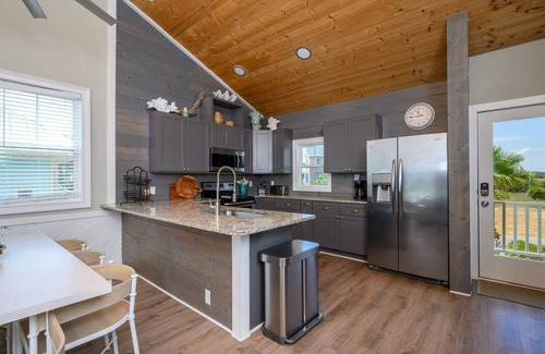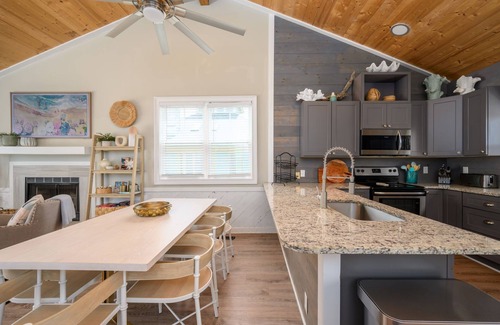 Gather in the open-concept living room to unwind after a day in the sun. Tune into your favorite show on the flat-screen television and cozy up on the sofa. The living room also features access to the deck. Enjoy cooking in the fully-equipped kitchen, and dine as a group at the eight-person table with additional seating at the breakfast bar.