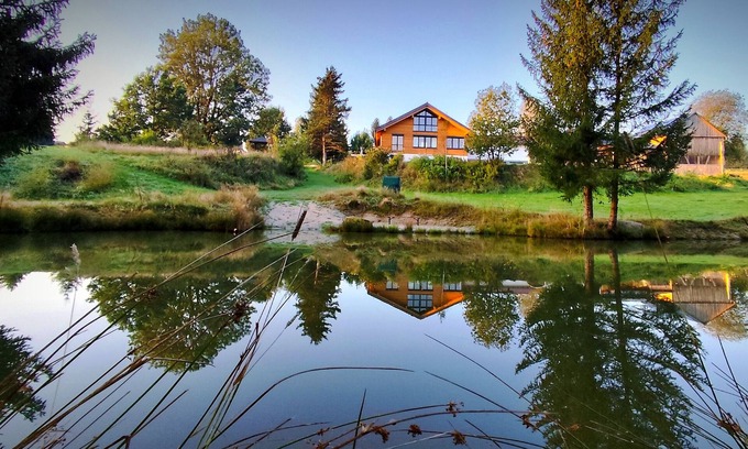 The bathing pond belonging to the Alm (also textile-free) with a nudist sunbathing lawn and the own trout pond (fishing possibility) let not only the fish swim! The Landgasthof Steinkohl is within walking distance.