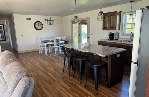 The home boasts a modern open floor plan, equipped with new appliances and recent updates. It features three bedrooms, including a spacious king bed with an ensuite full bathroom, a lovely queen bed, and a snug full bed, ensuring restful nights. Additional amenities include central heating and cooling, WiFi, and a washing machine and dryer. A second bathroom offers a soothing shower with a tub.