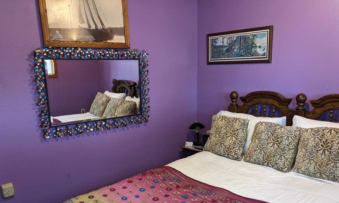 Romantic purple bedroom with beautiful bay and trees that provide wonderful shade, this property in the middle of nature is unique in its own way, which makes it even more surprising.
