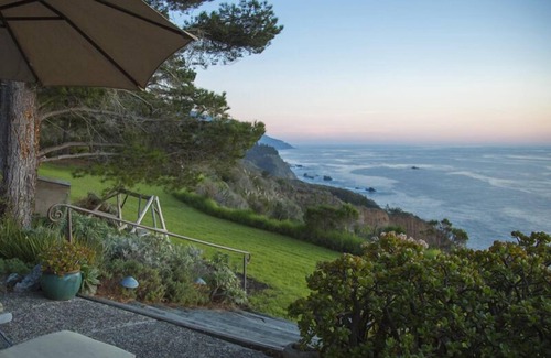 Enjoy the beauty of Big Sur in this unique redwood, rock & glass oceanfront cliff-side Guesthouse, that is embraced by tall cypress and Monterey pines, on a gently sloping rolling green lawn to the Pacific’s edge.