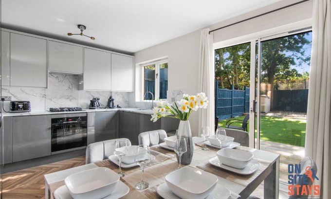 OnSiteStays - EARLY CHECK IN AUGUST - Modern 3 bed House, 2 x Parking, Garden, WIFI & dishwasher is located in Bromley, just 3.2 miles from Blackheath Station and 4.3 miles from Greenwich Park. This apartment offers free private parking, private check-in and check-out, and free Wifi. Crystal Palace Park is 5.5 miles away and Canada Water Tube Station is 6.5 miles from the apartment. Offering a patio and garden views, the spacious apartment includes 3 bedrooms, a living room, flat-screen TV, an equipped kitchen, and 1 bathroom with a bidet and a bath. Towels and bed linen are featured in the apartment. The property has an outdoor dining area. O2 Arena is 6.6 miles from the apartment, while Tower Bridge is 7.9 miles away. London City Airport is 10 miles from the property.