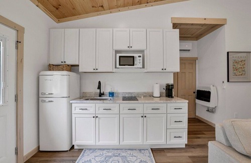 When you walk into the Onyx you will find a living space with a kitchen, dining table for two, and a couch and 50" TV. Through the large sliding door we have a covered porch with Adirondack chairs and a wood burning fire pit. The kitchen has a fridge, microwave, and two burner cook top. We also have a Keurig K cup coffee maker. In the bedroom you will find large windows, a queen bed, TV with DVD player and a closet. We have a stackable washer/dryer in the hall closet. In the full bath there is a walk in shower with glass sliding door. Outside there is a paved sidewalk leading to the covered hot tub area.