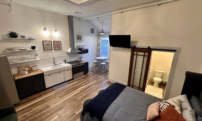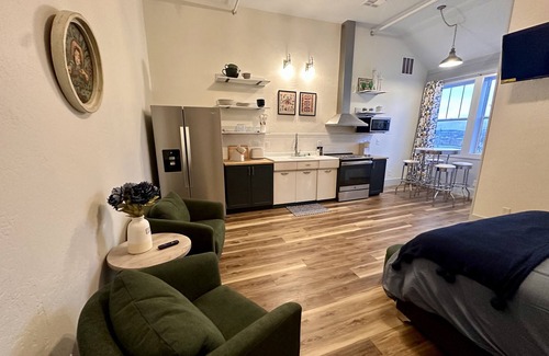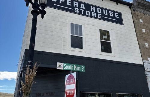 This fully remodeled apartment is located in the historic Opera House on the triangle in Kemmerer. The loft style studio apartment has full laundry and full kitchen. This historically charming studio has a queen bed, table area, and small seating area. This freshly remodeled apartment offers, style, amenities, and the perfect location. The apartment has downtown views that overlook the historic JC Penny House and the Kemmerer downtown district. It is in a prime location in Kemmerer. The apartment is walking distance to coffee, shopping, the visitor's center, the original JC Penny store, bars, and grocery shopping. Private parking is available behind the Opera House Store.