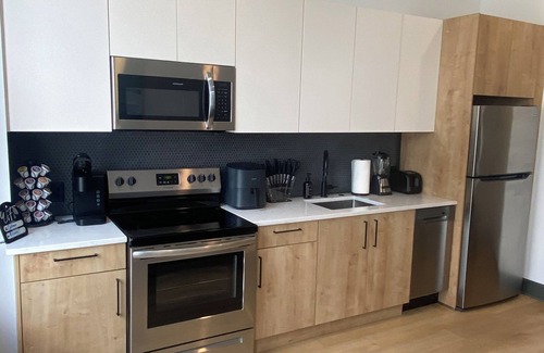 Your stay includes a range of thoughtful amenities designed to enhance your experience. The well-equipped kitchen is perfect for preparing celebratory meals or intimate breakfasts, featuring modern appliances and a convenient Keurig coffee maker. After the festivities, unwind in the inviting living area with plush seating and a smart TV for entertainment. Additionally, enjoy complimentary high-speed WiFi and dedicated parking, ensuring that all your needs are met during your stay at Optimum - Downtown Sanctuary!.
