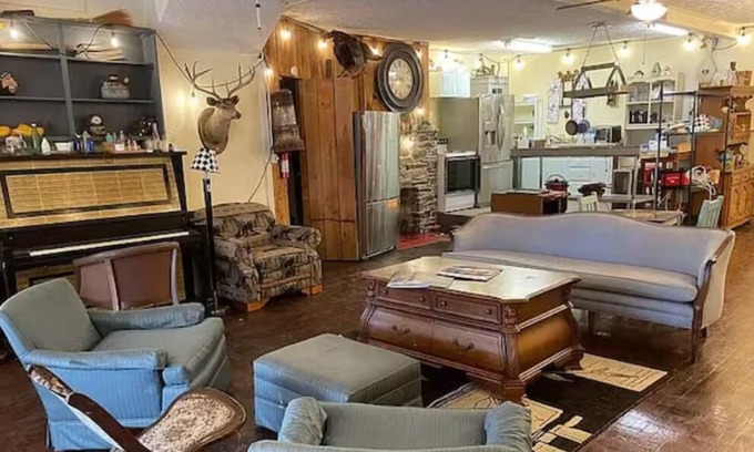 The home also features a dining table that seats 12. There's plenty of cookware and dining sets, as well as silverware, coffee, and filtered water.