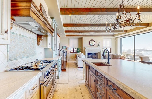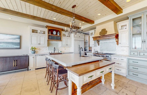 The upscale kitchen features a full suite of appliances - including a gas range and custom-paneled fridge. A wine fridge stores your favorite bottles at the perfect temperature, and a gleaming kitchen island has seating. Serve home-cooked meals at the dining table overlooking the beach.