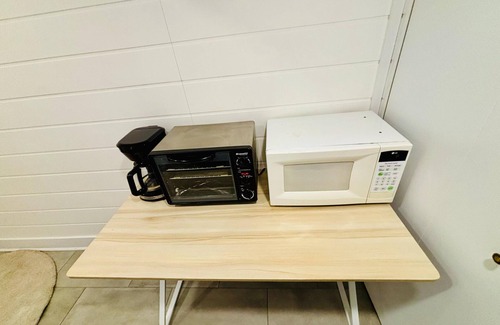Our fully equipped kitchen includes a stove, oven, refrigerator, microwave, coffee maker, and toaster, along with cooking basics like pots, pans, oil, salt, and pepper, making meal preparation a breeze.