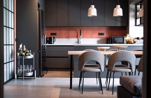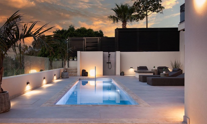 The minimal style luxury-decorated suite is built on the lower floor of the building. From the parking behind the house a staircase leads down to the entrance of the suite. It features an open plan living/dining/kitchen area and 2 double bedrooms with each an ensuite bathroom with walk in shower. The third bedroom with ensuite bathroom is attached to the suite but has a separate entrance from the swimming pool area, offering more privacy and featuring an extra space with fridge, coffee machine and kettle. All rooms have individual air conditioning and heating, Smart TV, a wardrobe and comfortable bed linens.