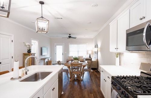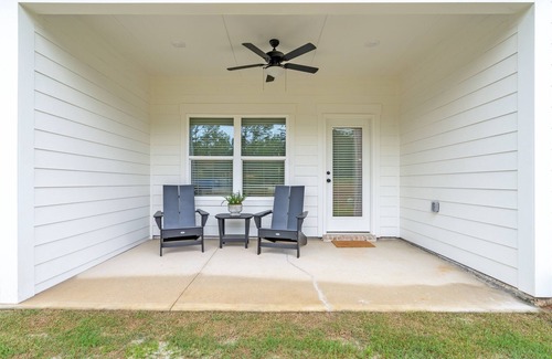 This gorgeous new townhome in Auburn with an open floorplan and cozy beds is perfect for your next trip to your favorite college town. The single level townhome connects a full kitchen with a breakfast bar, laundry closet, dining room, and great room for a functional gathering space. The primary bedroom with a king-sized bed features an ensuite bathroom with a double vanity, walk-in shower, and spacious closet. The second bedroom with queen-sized bed is located at the front of the home away from the primary suite for privacy. A hall bathroom is available for guests staying in the second bedroom and for easy access from the living spaces. The covered patio is perfect for winding down after a busy day in town!