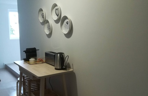 It also has small appliances such as hair dryer, toaster, coffee maker, water heater, oven, microwave, etc.