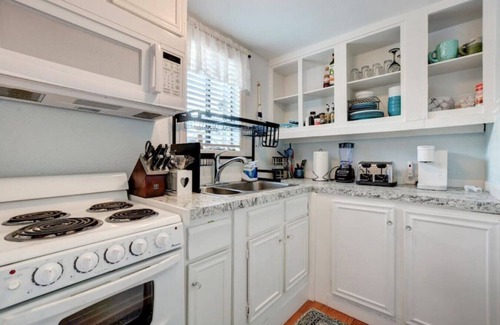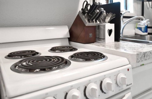 The kitchen has a full-size refrigerator/freezer, oven, stove, and microwave. We have pots, pans and utensils. There's also a single brew coffee maker with coffee, tea and cocoa pods.