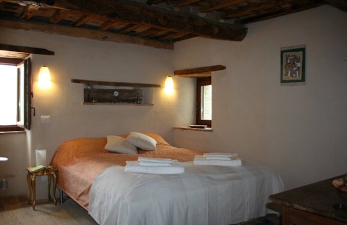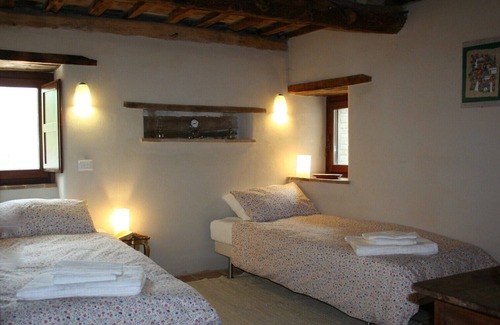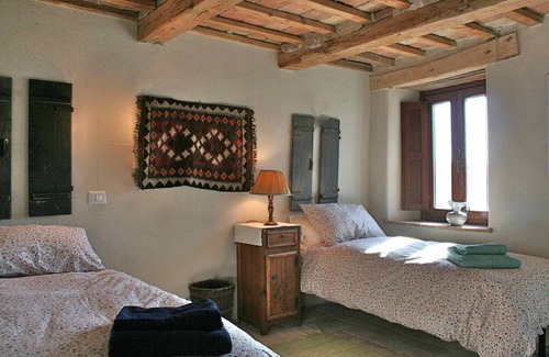 A beautifully restored, warm and very welcoming farmhouse with a sustainable and environmentally friendly approach to all aspects of our activity. Sleeps up to 8 with full kitchen; dining room; sitting room; 2 bathrooms; outside dining, lounge, grilling and children's play areas all set within an olive grove, vineyard, grapevines and other fruit trees. Over 350 years old, this farmhouse was originally a grain mill and “cotto” for local wine. A beautiful home with great character and history and where all rooms are peaceful, relaxing and uniquely decorated. Natural building systems mean indoors is both cool in summer and warm in winter – perfect because this area has activities for every season. The land is tended naturally: olives, vines, vegetables and herbs; and wonderful wildlife: butterflies, lizards, boar and birds of prey are everywhere. Spectacular scenery in all directions – hilltop towns: Colmurano, Sarnano, Macerata and the Monti Sibillini – means the view is one of the best in unspoilt Le Marche. It is surely the most romantic place to see the full moon float across the horizon. Welcome!