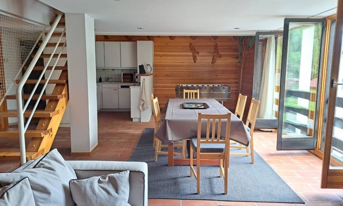 One area is dedicated to the modern fireplace suspended from the ceiling (PLEASE NOTE: the fireplace is only decorative and CANNOT BE USED!), surrounded by sofas that invite one to gather around the fire during winter evenings. The dining table for six is perfect for dinners with friends, and a play area with a table football provides entertainment for children or groups of friends.