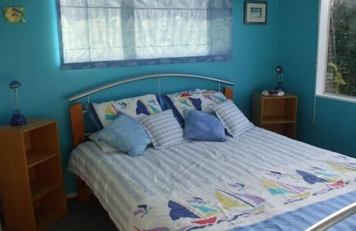 Bright and cheerful, cozy, well-equipped, north-facing, indoor-outdoor flow. Enjoy barbeques under the shade sail on large deck. Garden setting, in the heart of Coopers Beach. Shopping center with essential amenities diagonally across the road.