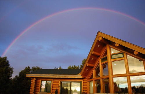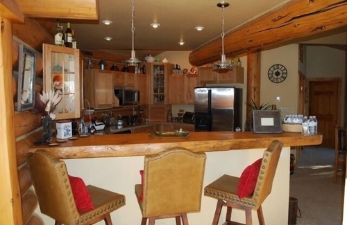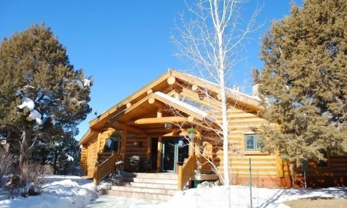 Built by respected log home builder - Larry Barnes - this wonderful Colorado custom log home enjoys peace and tranquility with majestic La Plata Mountain Views inside and out. Driving up to the house with its Silverton Eureka Rock driveway easily accommodates multiple cars and convenient in-and-out access. This great Colorado log home is located minutes to shopping/restaurants in Historic Downtown Durango as well as 3 major ski areas. Walk up the slate-tiled steps to the covered porch and enter this lovely home through the double glass doors. The home immediately opens to a huge western facing bay of windows in the living/dining room perfectly positioned to take in the grand mountain views. Located to the left of the entryway is the kitchen equipped with granite tile countertops, slate tile floors and stainless steel appliances. Birch cabinets and drawers filled with everything you will need to make your vacation feel like home. A breakfast bar for 3-4 people is made from a large piece of dimension lumber which further enriches the log home feel. A spiral staircase leads up to the loft area which looks out over the living/dining area and enjoys the same massive bay windows as the living room. This room has a queen futon. The living/dining room's high vaulted ceiling is complimented by solid log cross beams. A two-sided wood burning fireplace with river rock surround offers the romantic ambiance of an evening fire to both the living room and the master suite. An elk antler chandelier overhanging the dining area adds a touch of Colorado flair. The master suite has its own patio access and a master bathroom that will surely satisfy. An oversized Jacuzzi bathtub sits in the corner of the master bedroom supported by a travertine surround. Relax in a warm jet bath! The bathroom also has a walk-in shower with travertine tile and dual sinks with stylish oval vanity mirrors. Don't forget about the dual-sided fireplace to keep you warm on those colder evenings!