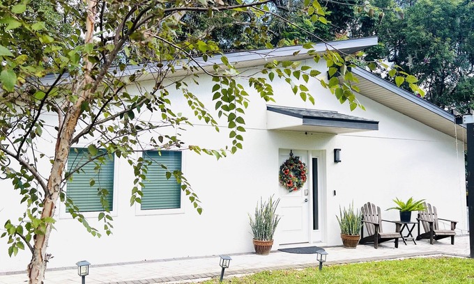 No Cleaning Fee! Discover a European oasis in sunny Florida at Orlando's Happy Guest House. Our newly built, free-standing 2-bedroom Contemporary Guest House promises a European experience. With its separate entrance and 2 bedrooms featuring 2 queen beds, it comfortably accommodates a maximum of 4 travelers. Only 10 min from Universal Studios and Volcano Bay Water Park, 20 min from Disney Parks, and 15 min from the vibrant Downtown Orlando (Lake Eola). Major roads and luxury shopping, perfect central location.