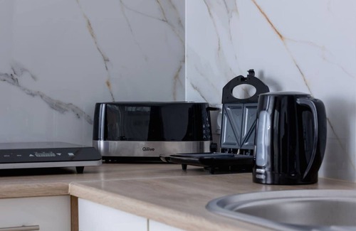 Electric hob, fridge with freezer, electric kettle, toaster, tableware