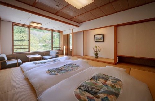 Best-rates for the Oshuku Onsen Choueikan starts from $116 per night with includes Toiletries, Parking, Designated Smoking Area, TV, Restaurant, Bar, Guest Services, Kitchen, Laundry, Air Conditioner, Wellness Facilities, Fireplace/Heating, Child Friendly, Internet, Accessibility, Bedding/Linens, Entertainment, Breakfast, Hot Tub with all other amenities. Perfect for Weddings is committed to ensuring every guest experiences a comfortable and extraordinary stay, whether planning a romantic getaway, a honeymoon, a pet-friendly stay, or celebrating with the entire wedding party.