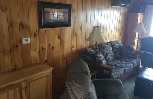 This cottage finished with knotty pine boards and real exposed beams comfortably sleeps 8 in 3 bedrooms and pull out sofa and has 1.5 baths. The cottage offers relaxation at every spot. Two decks to view the sun rise in the morning or over seeing the beach during the day. The other for sitting in shade overlooking the marsh were wildlife will usually be seen. Park your boat at your own private dock. A kitchen with every thing you would need a table to sit 8. Enjoy the walk in sandy beach in your front yard. Kayak on lake or nearby bearcamp river. Sheets, blankets & towels are supplied. We encourage 7 day stays with 10% discount.