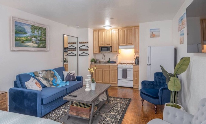 A cute and cozy studio with one Queen bed and a fold out couch that opens into another bed.