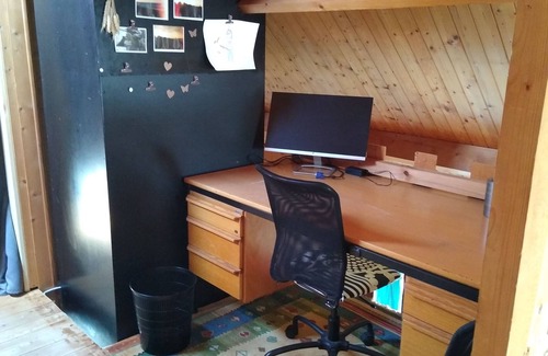 Mezzanine with office for teleworking. 1 bathroom (bubble bath and washbasin) adjoining 1 large Bedroom giving access to the Solarium on the wooden terrace. Independent WC.