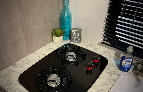 Guests will enjoy a queen bed, a dinette, a kitchen with microwave, refrigerator, gas stove top, and coffee pot. The kitchen will be stocked with pots, pans, and utensils if you want to prepare a meal. Plates and cups are also provided. Many restaurants and grocery stores are very close by.