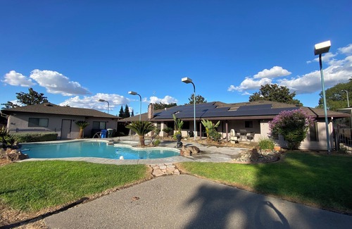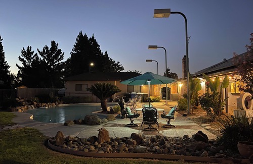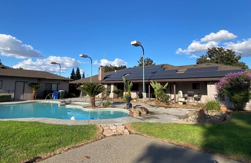 Nestled in a beautiful area in Manteca, this delightful home offers 4 bedrooms with a mix of queen, bunk, twin, and king beds. With 3 bathrooms equipped with hair dryers and showers, guests can freshen up with the comfort of home. The property also features amenities like a washing machine, and dryer, iron, WiFi, AC, and heating, game room, large pool & hot tub ready to host large gatherings. We're 5 minutes away from Hwy 120, Hwy 99, Hwy 5, GREAT WOLF LODGE & Costco Shopping Center, BLD Field Of Dreams, Woodward Sports Park, Bass Pro Shop, AMC Theaters, & Downtown Manteca. Make your holiday one for the books all year around with a stay at our place.