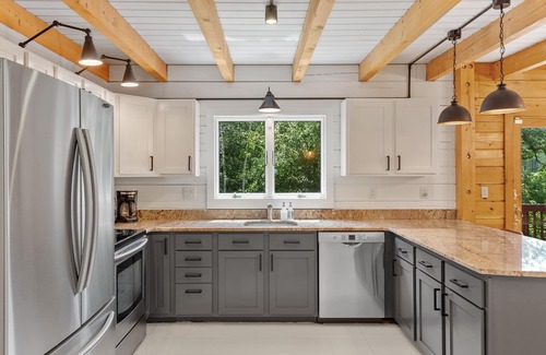 As you step inside, you'll be greeted by the inviting atmosphere of the cabin. The large, fully equipped kitchen is ready to cater to all your meal plans, and the adjacent dining room provides a cozy setting for shared meals and memorable conversations.