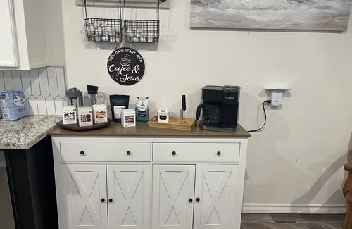 The kitchen has the basic tools for cooking, pots/pans/utensils, etc. There is a toaster, toaster oven, Reverse Osmosis water for drinking, a Keurig dual machine for both coffee pods and drip coffee. We are working to add more to entice the best of cooks.
