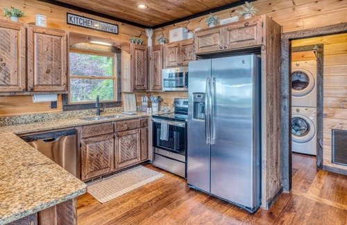 When you first enter the cabin, you'll be astounded by the custom woodwork in the kitchen and living room.