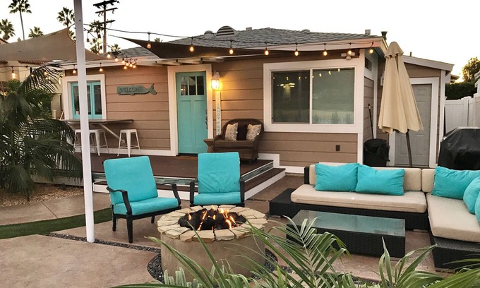 Kayadon 1 is considered a well-equipped 1-1/2 bedroom, 1 bath unique beach cottage utilizing an open concept design. What is a half bedroom, you ask? The expanded living area can be sectioned off with a gliding wall for privacy to make a half bedroom with full-sized memory-foam murphy bed and closet. The kitchen includes all new stainless steel appliances and windows that open to create an indoor/outdoor dining area, seating up to six people. Serve up your family and friends, just like a local beach bar. The large out door living area has plenty of comfortable seating for people watching and enjoying the cool ocean breeze. For the evening, the fire pit and overhead market lights provide warmth and ambiance. The cottage is on La Jolla Blvd. which is active during the day, but quiets down at night. If you are a person who is an EXTREMELY light sleeper, we provide sound machines for each bedroom. Kayadon 1 can sleep 4 in beds depending on the closeness of your group with one queen and a full. Keep in mind, it will be cozy! The cottage is equipped with both washer and dryer as well as central air conditioning making your stay comfortable, no matter what the weather!