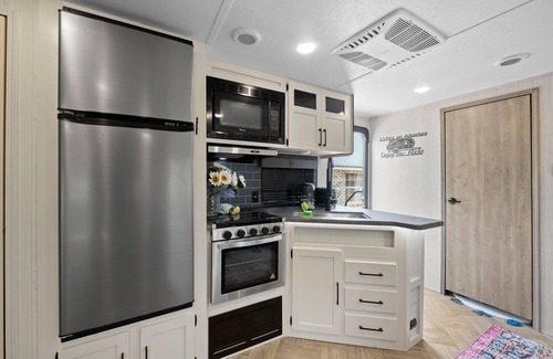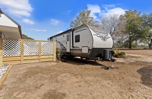 Escape to this spacious 35-ft camper with 2 queen bedrooms & extra sleeping areas. Enjoy soft linens, Smart TVs, and a fully equipped kitchen with a pantry, fridge, oven, stove, toaster, coffee maker, dishes, and cookware. Full bathroom, and all toiletries. Relax on the deck with surround sound, grill, outdoor fridge, and fairy lights. Just steps from fire pit, hot tub, indoor heated pool. An art studio is also on-site (fees apply). Enjoy a secluded spot in nature with top-tier amenities! Breakfast.
