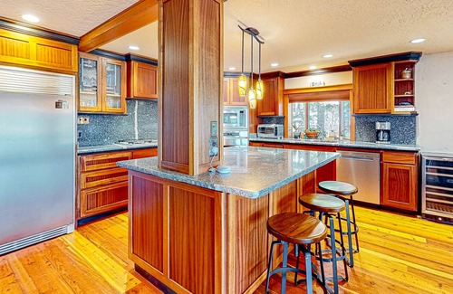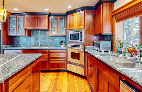 Continue to enjoy the area's beauty from inside the spacious living room where a soft sofa and a large TV provide the perfect spot for family movie nights. The chef's dream kitchen shines with its high-end appliances, ample meal prep space, and breakfast bar. Whip up delicious dishes here before serving your creations at the sprawling, formal dining table, or alfresco on the deck's ample outdoor seating.
