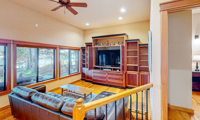 Shrouded in sunshine and surrounded by gorgeous water and mountain views, find Riley Creek Retreat. A nature lover's paradise, this waterfront home offers private dock access and kayaks. When you aren't gliding across the gleaming blue water, hang out on the scenic deck and prepare a delicious barbecued meal - a true ode to summertime.