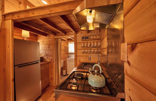 Tiny House 1 is a year-round rustic cabin made from locally hewn rough cut lumber. It has a sleeping loft with a queen size bed and a single day bed, accommodating up to 3 guests. There is a full kitchen and bathroom as well as a deck with an outdoor dining table. There is central heat for the winter, window A/C units for the summer and a smart TV. Tiny House 1 guests can also enjoy a private picnic table, firepit and charcoal grill.