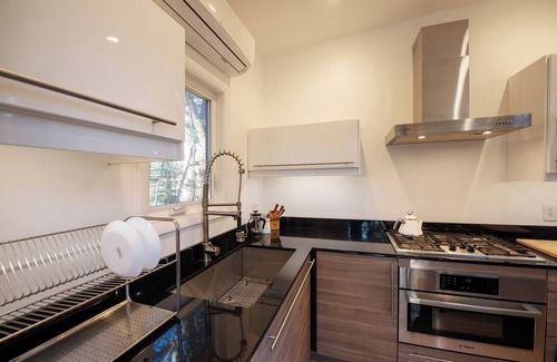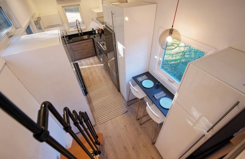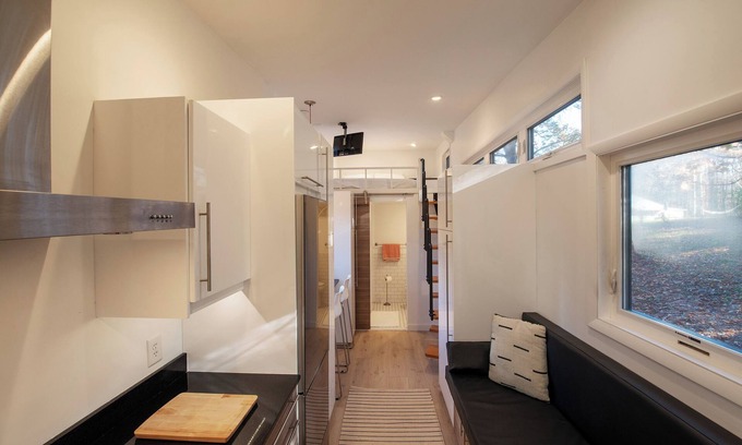 Tiny House 2 is a bright and modern year-round home which features an open plan with a sleeping loft and queen size bed. There is a full kitchen and dining nook along with a full bathroom. There is central heat for the winter, central A/C for the summer and a smart TV. Tiny House 2 guests can enjoy a private picnic table, firepit and charcoal grill.