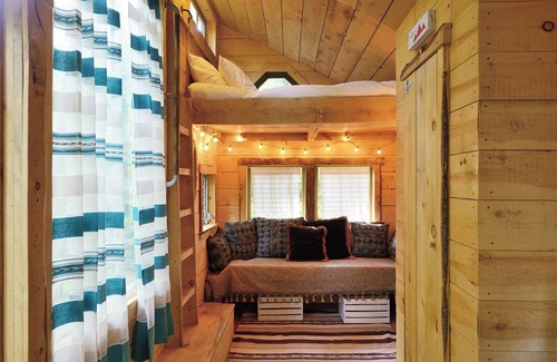 Tiny House 3 is a cozy and bright and built out of rough-hewn local pine and hemlock. It features a sleeping loft with a full-size bed as well as a single day bed, for a total of up to 3 guests. There is a writing nook and a closet. There are electrical outlets and Wifi. There are fans for the summer and an electric space heater for early spring and fall. Tiny House 3 guests have a private firepit, charcoal grill, hammock and outhouse. They have access to the communal outdoor kitchen, outdoor shower with hot water on demand, and covered outdoor dining area. They also have access to the communal sauna. Available mid-April to mid-November.