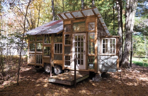 Tiny House 4 is a unique accommodation, built entirely out of recycled materials. It features a wall of antique windows which look out into the forest. Tiny House 4 has a sleeping loft with a full-size bed as well as a single day bed, for a total of up to 3 guests. There is a writing nook and a closet. There are electrical outlets and Wifi. There are fans for the summer and an electric space heater for early spring and fall. Tiny House 3 guests have a private firepit, charcoal grill, hammock and outhouse. They have access to the communal outdoor kitchen, outdoor shower with hot water on demand, and covered outdoor dining area. They also have access to the communal sauna. Available mid-April to mid-November.