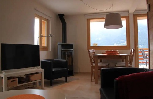 Outside: 4-person chalet with balcony, terrace with garden furniture, breathtaking views of the Val is located in St. Luc. Outside: 4-person chalet with balcony, terrace with garden furniture, breathtaking views of the Val provides accommodation, featuring Parking, Kitchen, TV, among other amenities. This Ski Chalet features Parking, Kitchen, TV, to make your stay a comfortable one.