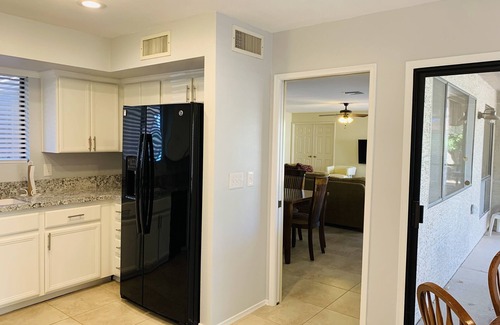 Immaculate home in Sun Lakes with an open floor plan, master bedroom with Queen bed and newly remodeled en-suite bathroom, the second bedroom has a Queen bed with en-suite bathroom. The home has a newly remodeled kitchen. Tile throughout the home and private patio with citrus trees. Close to club house, pool, hot tub, golf course, restaurants and new fitness center.