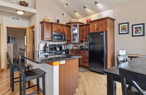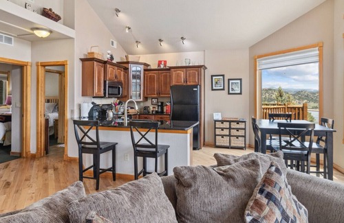 After a day exploring Rocky Mountain National Park, curl up by the gas fireplace and unwind with a good book or movie. The open-concept kitchen is fully stocked for cooking meals at home, while the private deck offers the perfect setting for dining with a view or sipping wine as the sun sets behind the peaks.